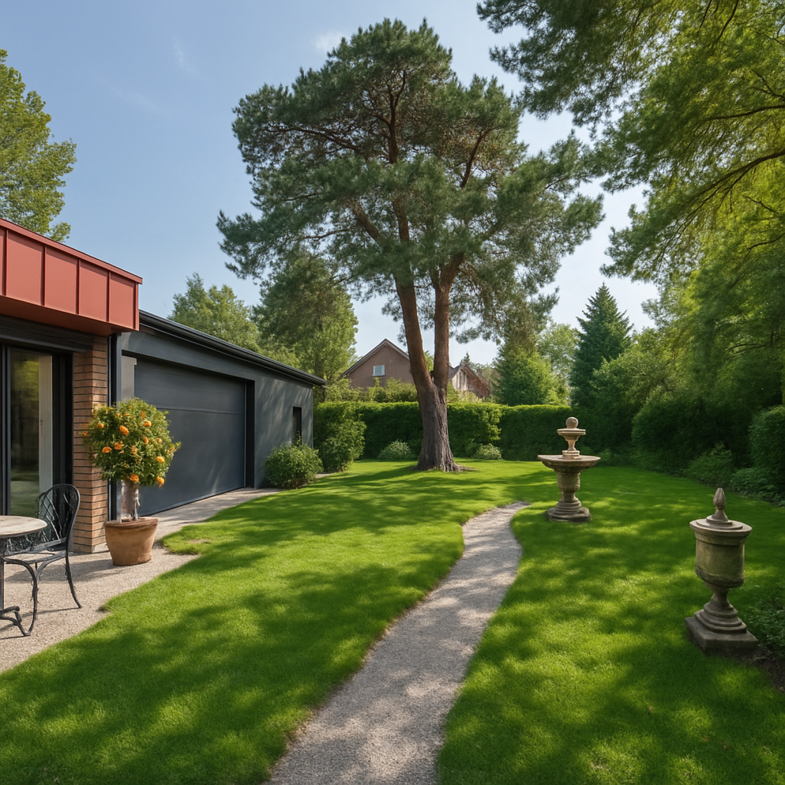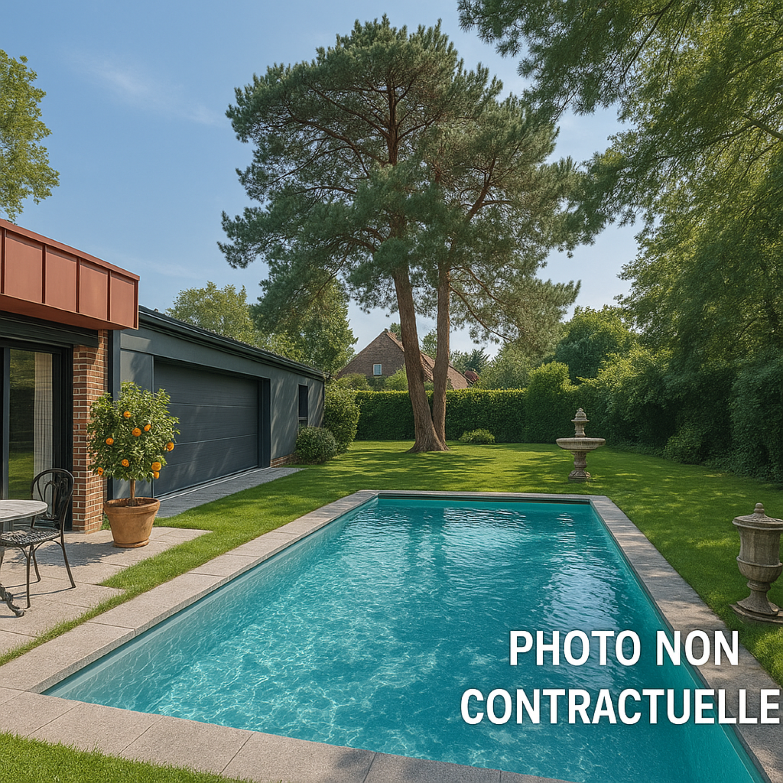 À l’extérieur, le jardin exposé sud est sublimé par une grande terrasse aménagée, parfaite pour les moments de détente. Un hangar de 75 m² complète les prestations, pouvant accueillir plusieurs voitures de collection ou être transformé en espace bien-être avec piscine.
